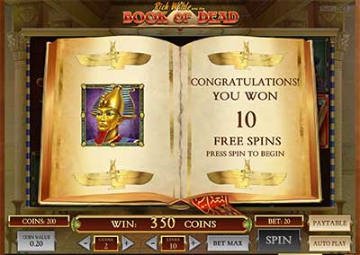 Die Freispiele beim Slot Rich Wilde and The Book of Dead sind das große Highlight des Play’n GO Spielautomaten. Diese werden durch das Buch als Scatter-Symbol ausgelöst, wenn es mindestens dreimal auf den Walzen erscheint. Eine bestimmte Position innerhalb der Gewinnlinien ist dafür nicht erforderlich. Mit Beginn der 10 Freispiele wird durch den Automaten ein zufälliges Bonussymbol ausgewählt, dass innerhalb der Linien erscheinen muss, um einen Gewinn auszulösen. Außerdem kann das Bonussymbol auf den Walzen mehrere Positionen einnehmen und so mit etwas Glück ein Vollbild komplettieren, was den Spielern einen besonders hohen Gewinn einbringt.